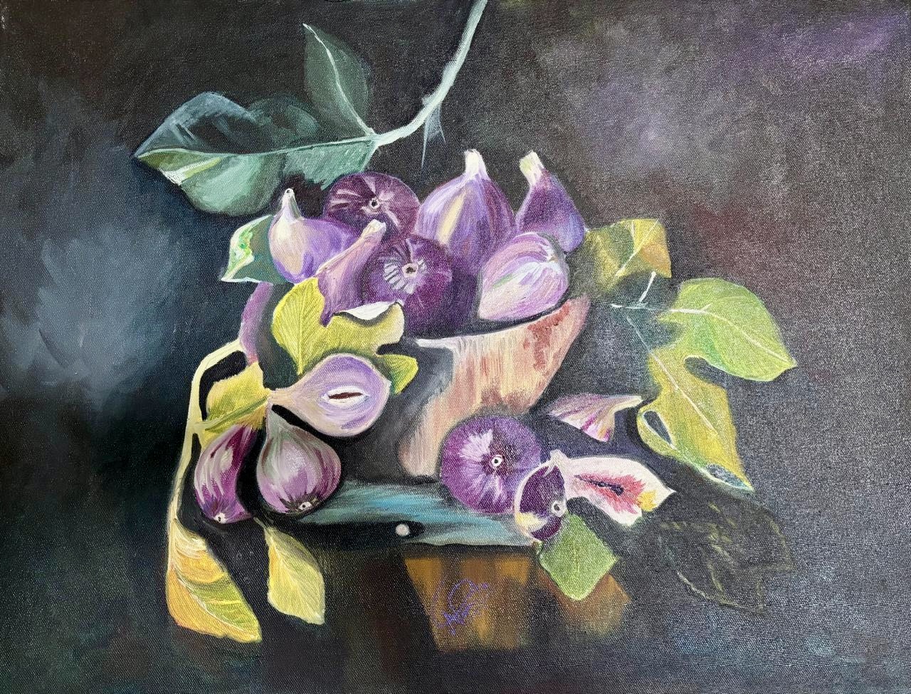 - The painting presents a collection of figs, some whole and others delicately sliced open, revealing their intricate, jewel-toned interiors.