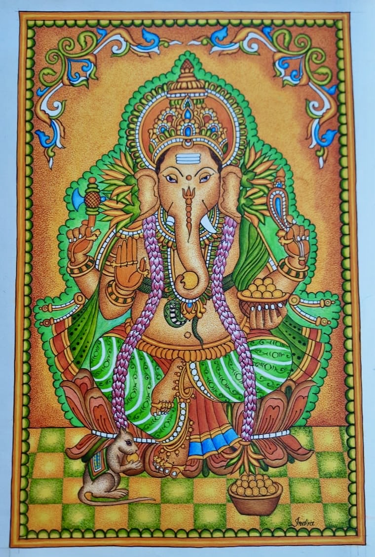 - Rendered in earthy tones and vibrant natural pigments, this Kerala mural painting encapsulates Gajanana’s benevolent essence, filling the space with divine grace, positivity, and an aura of auspicious blessings.
