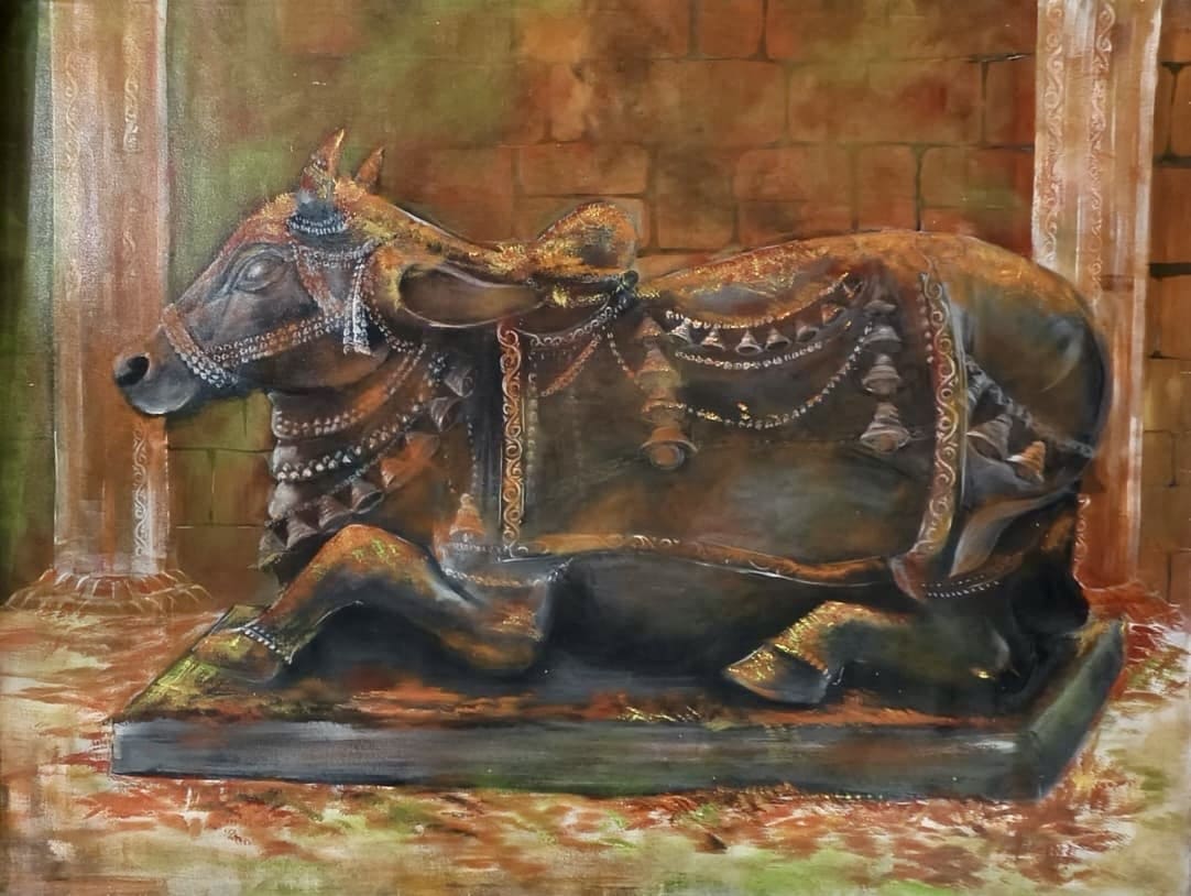- The painting beautifully captures the divine presence of Nandi, the sacred bull and devoted guardian of Lord Shiva.