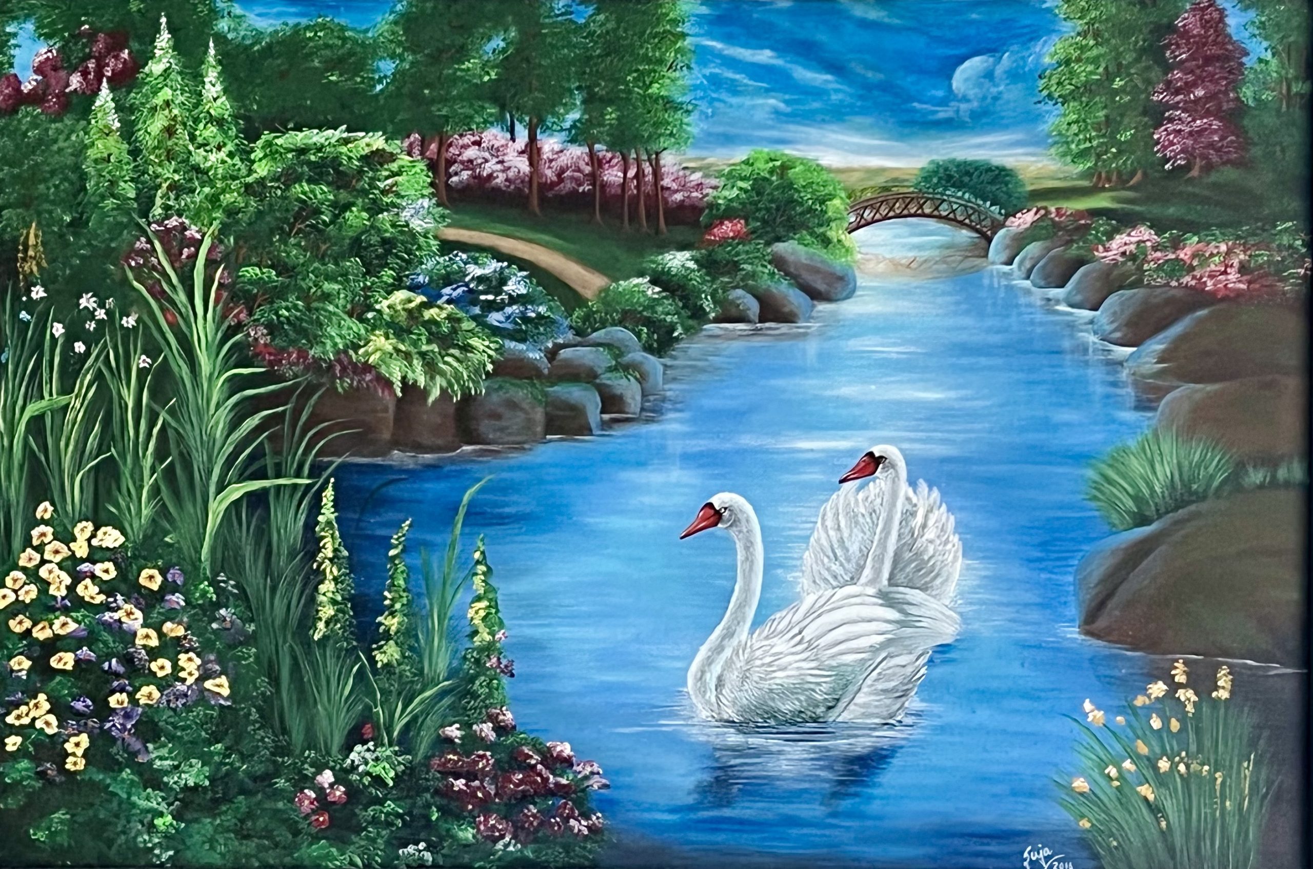 - The painting captures a picturesque scenery where elegant white swans glide effortlessly across the calm, reflective waters of the lake.