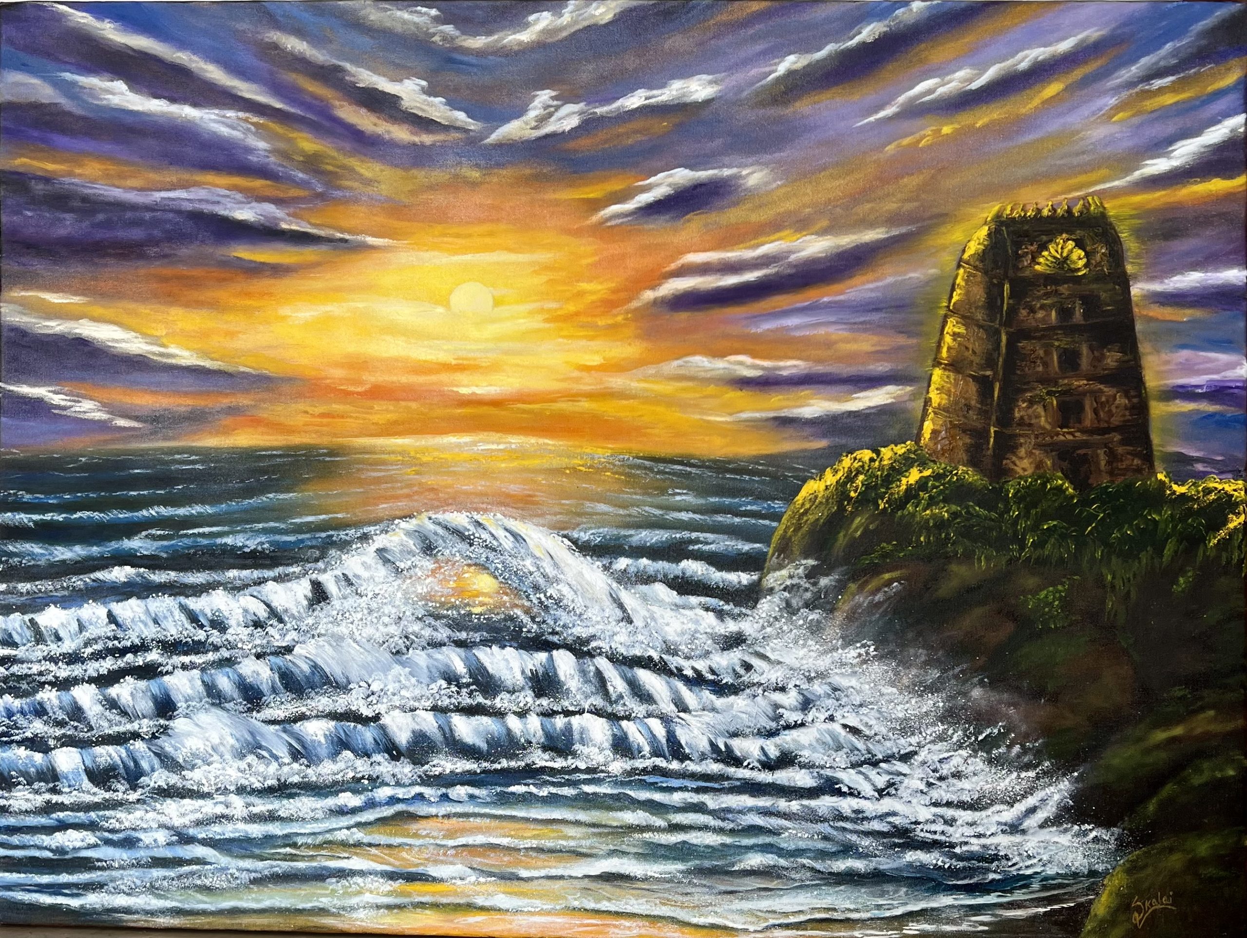 • This painting beautifully captures the grandeur of a temple gopuram set against the vastness of the mighty sea, bathed in the golden embrace of the sun.