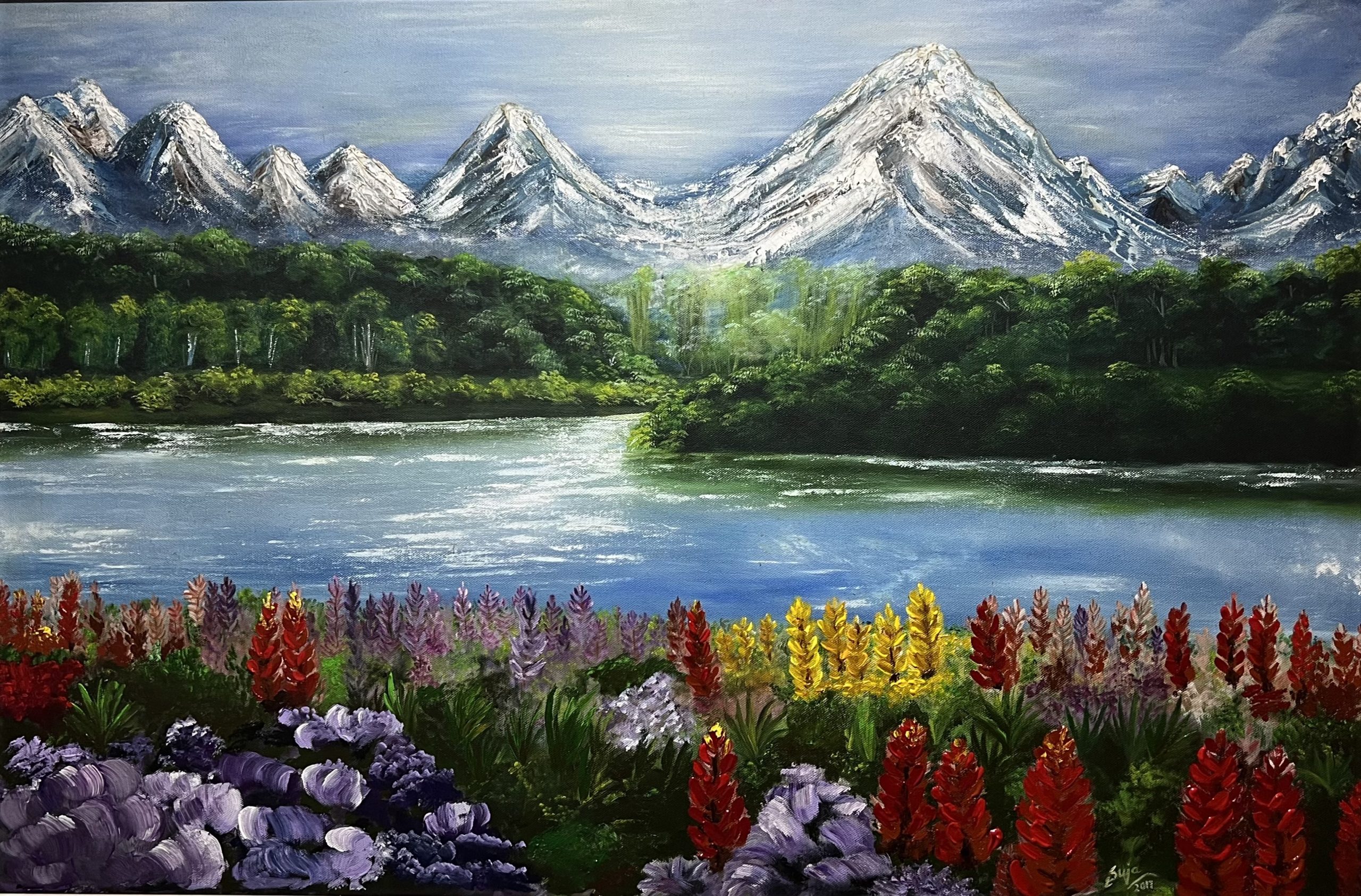 - The foreground features vibrant flowers in colours of red, yellow, and purple bloom in abundance, adding a lovely contrast to the cool blues of the tranquil lake.