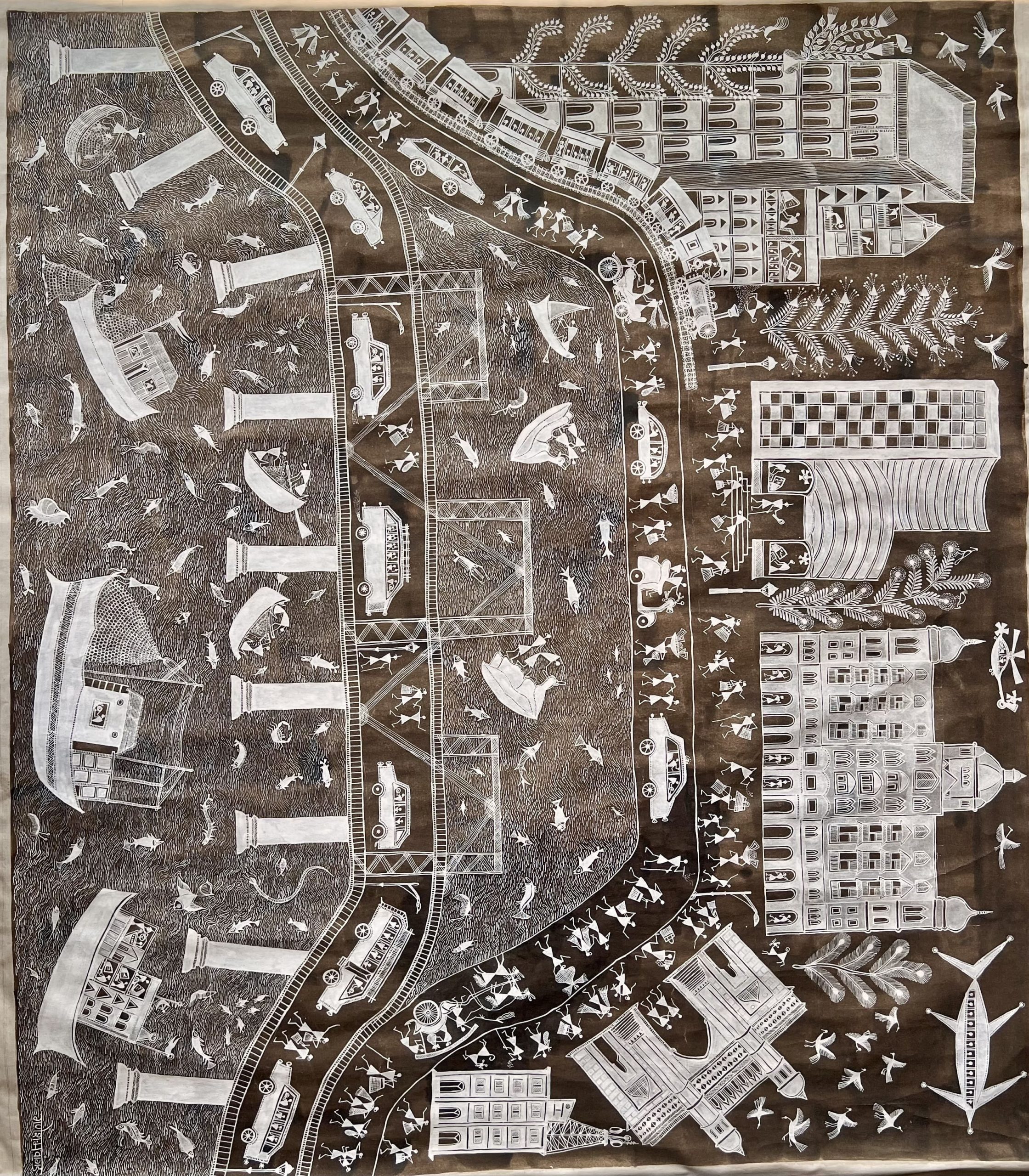 This Warli painting blends tradition and modernity, showing tribal life with farmers, dancers, and huts alongside cars, bikes, schools, and phones—celebrating cultural roots evolving with the times.
