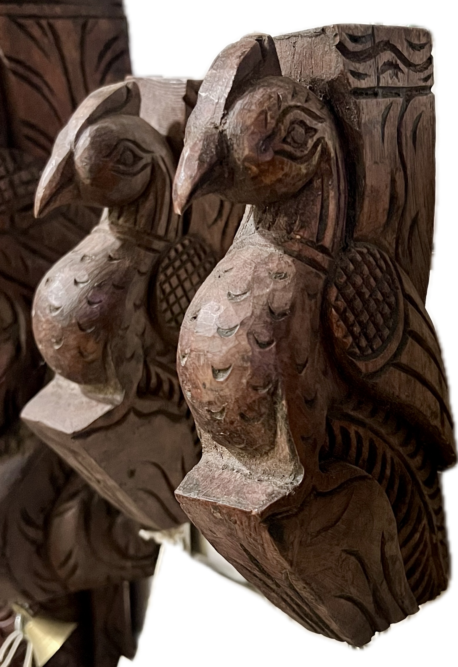 - This hand-decorated wooden bracket features magnificent peacocks known for its elegant form and vibrant symbolism. It is intricately carved with detailed feathers, a gracefully arched neck, and ornamental patterns that showcase the exceptional skill of traditional artisans.